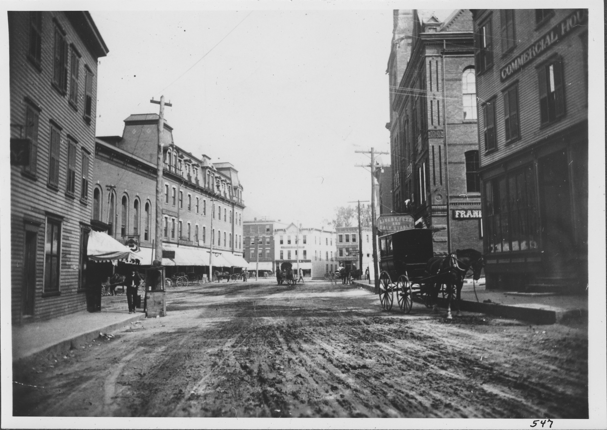 The Square. Bellows Falls, VT. From Rockingham St. 1880s. Extreme left - Baldasaro's fruit store with Peanut Roasting Machine at curb. Extreme right - Commercial House built about 1887 by H.S. Frost.