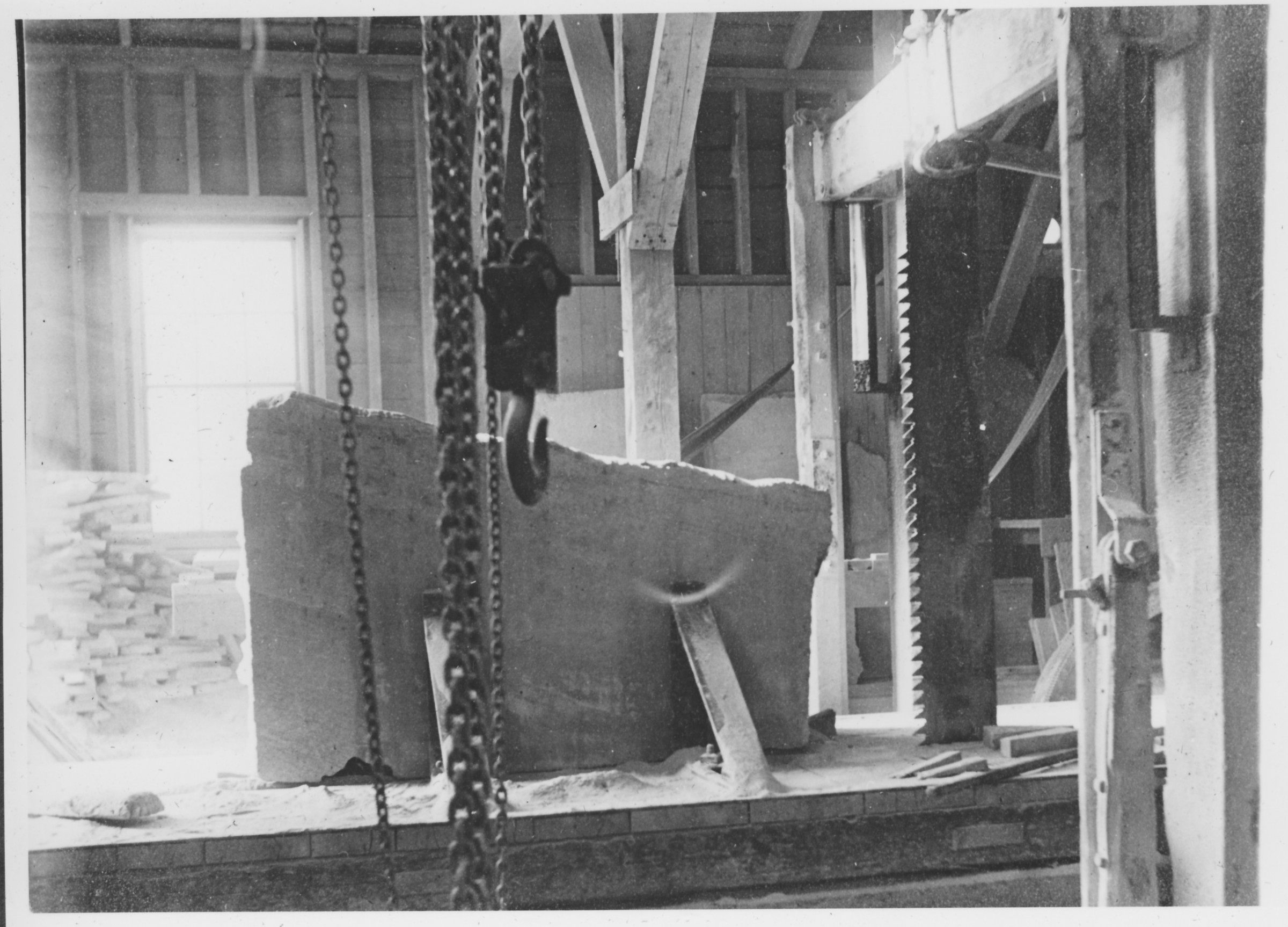 Soapstone Mill: Saxtons River, VT. Block moves toward rough cutting vertical saw.